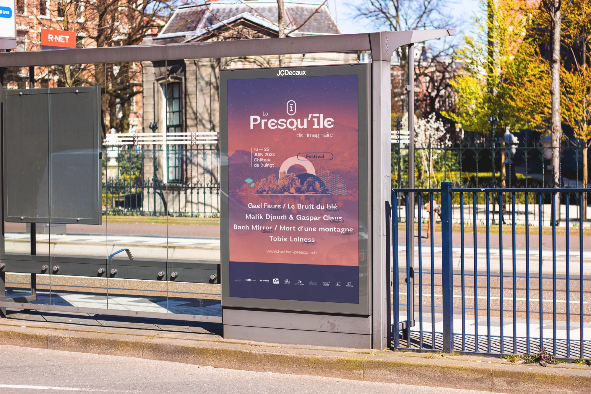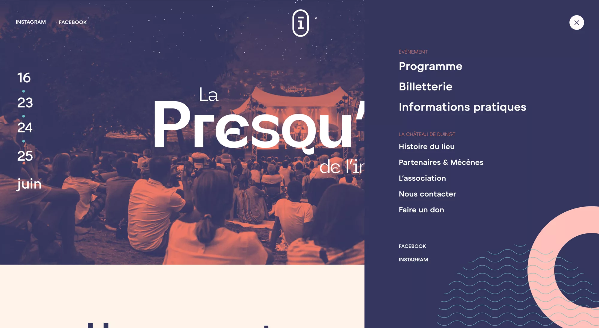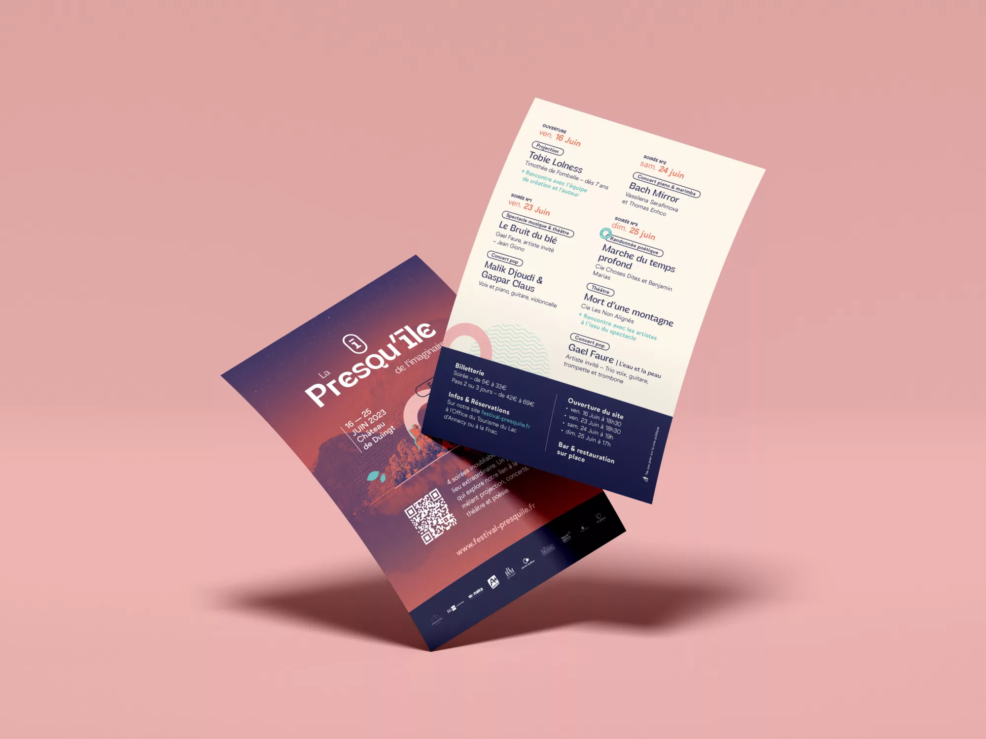 La co-création a été déterminante dans l’aboutissement de ce projet. En effet, l’association craignait de trop s’éloigner des communications précédentes, dont les affiches étaient très centrées sur la presqu’île du château de Duingt, dans des codes graphiques plutôt axés “expo photo” que “festival de musique”. Nous avons donc conservé une photo comme base de l’affiche, sur laquelle nous sommes venu construire une identité plus singulière, grâce à des éléments graphiques géométriques et colorés, ainsi qu’une typographie dessinée pour l’occasion. Sur le reste de la communication (PLV et site web), nous avons pu nous éloigner de l’aspect photographique avec plus de subtilité et de parti pris graphique. Les problématiques UX ont également donné lieu à de nombreux échanges et prototypes fonctionnels de façon à lier les événements par soirée et proposer des extras, parfois hors les murs, le tout de façon intelligible.