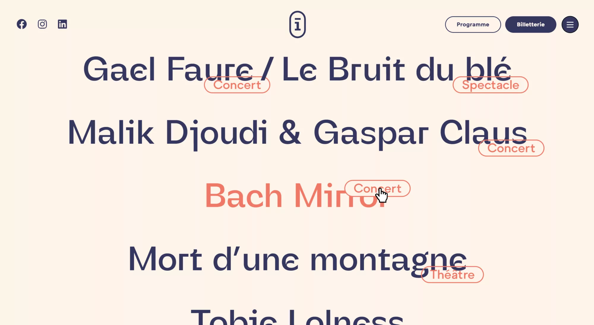 Quand nous le pouvons, nous ajoutons des éléments interactifs de façon à rendre la navigation plus ludique et laisser une empreinte chez le visiteur. Ici, les cartouches positionnés sur le line-up font office d’information de contextualisation (style de spectacle) et suivent le curseur de la souris pour indiquer que l’élément est cliquable, pour aller directement sur la fiche spectacle.